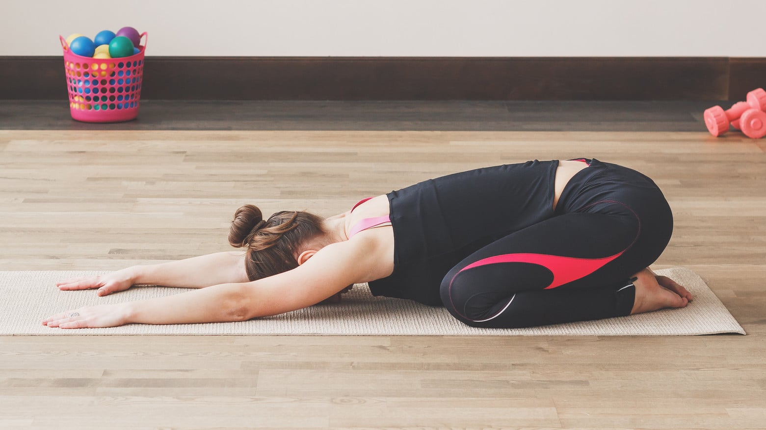 1. Posaďte se na kolena s hýžděmi na patách. Horní polovinu těla ohněte k podložce, položte ruce na podlahu před sebou dlaněmi dolů a s nádechem dosáhněte, co nejdále to půjde, zatímco hýždě zůstávají na patách. Vydržte s čelem opřeným o zem tak dlouho, jak můžete, a „dýchejte“ do dolní části zad.