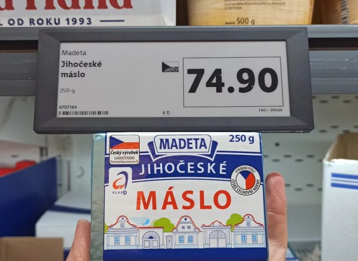 V listopadu 2024, tedy rok a čtvrt zpět jsme psali o tom, jak ceny másla v obchodech atakují dříve nemyslitelné hranice. Dvě stě padesát gramů másla v říjnu 2024 stálo průměrně 68,80 korun, v listopadu už se cena blížila pětasedmdesáti korunám na kostku.