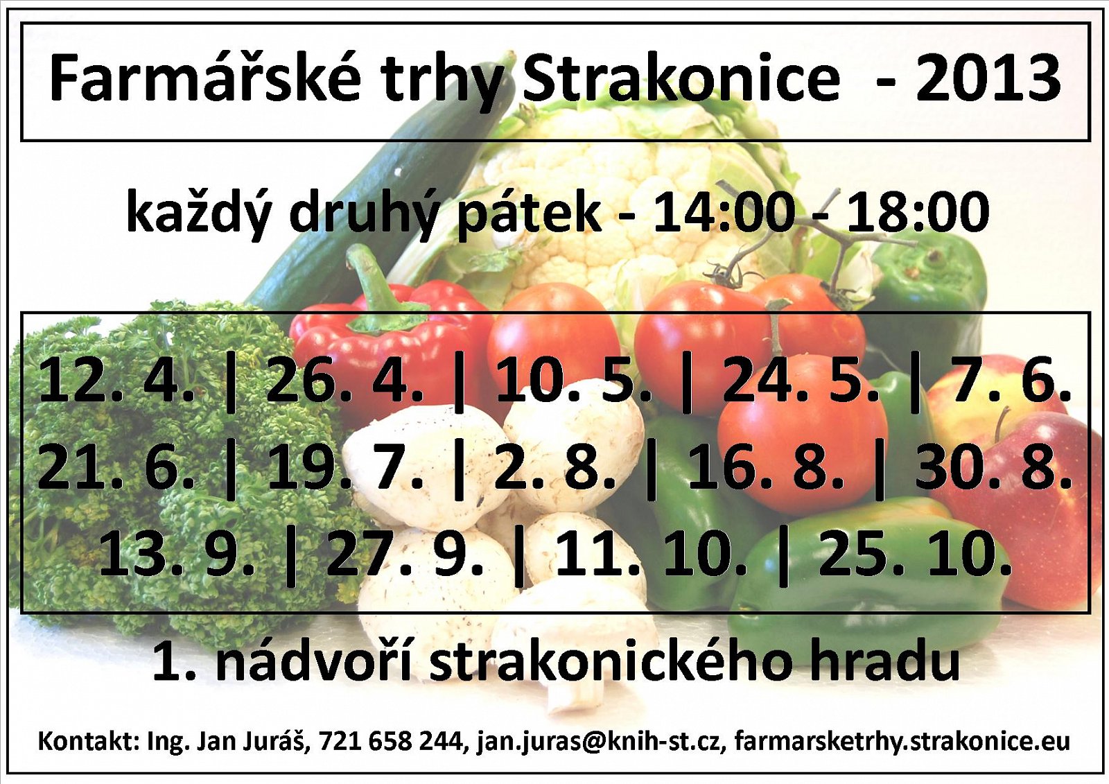 V sezóně 2013 se budou strakonické farmářské trhy konat každý druhý pátek od 14 do 18 hodin. Opět zde bude možno nakoupit širokou škálu rostlinných a živočišných produktů. „Nebudou chybět ani řemeslné výrobky. Připravujeme také doprovodný kulturní program,“ říká za pořadatele Jan Juráš.