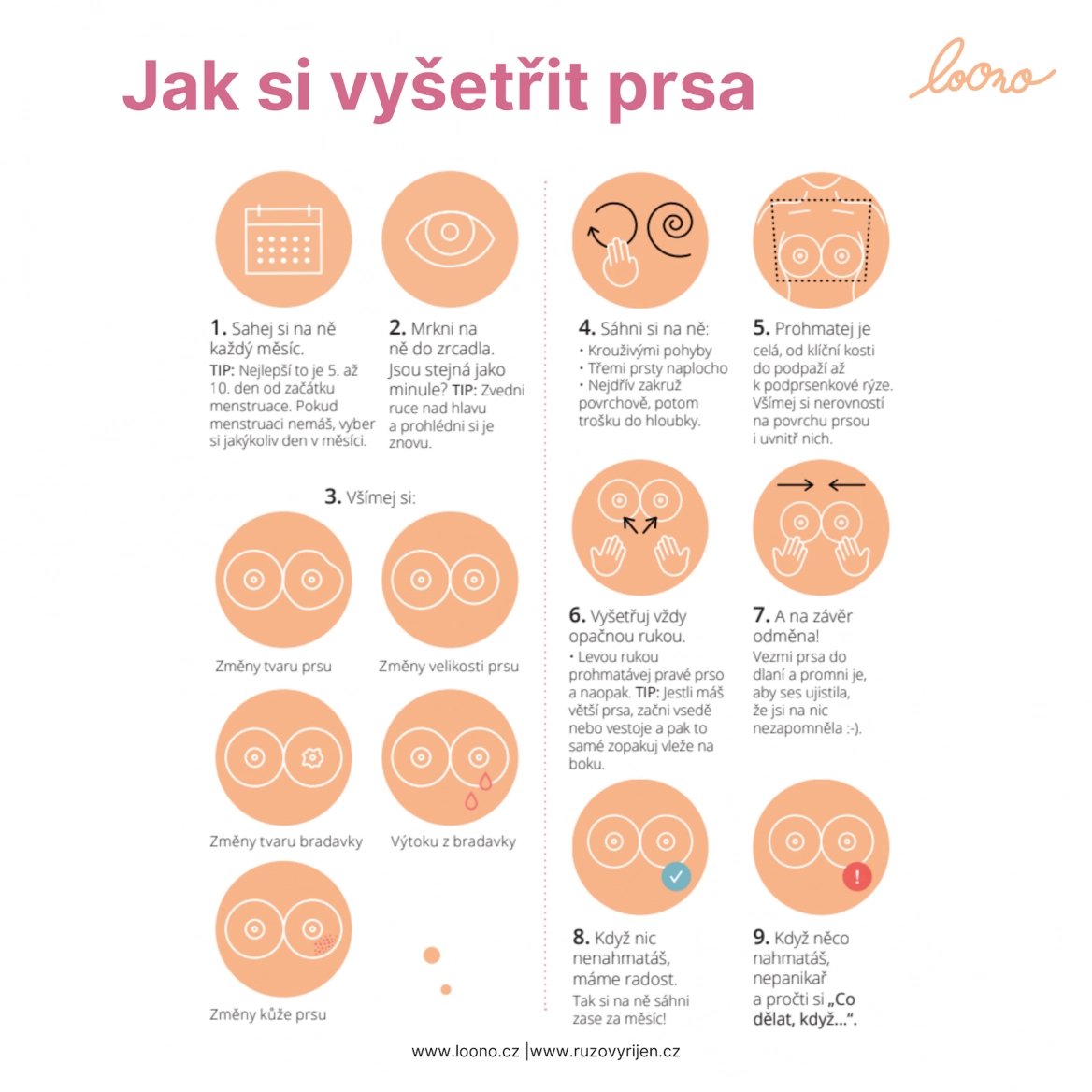 Všímat byste si při tom měla především výtoku z bradavek, změn kůže prsou, změn tvarů prsou či bradavek (například i vpáčení bradavek) a také změn velikosti prsou. Podezřelá jsou vtažená místa či naopak vyklenutí, barevné změny, zarudnutí nebo výrazně viditelné žíly.