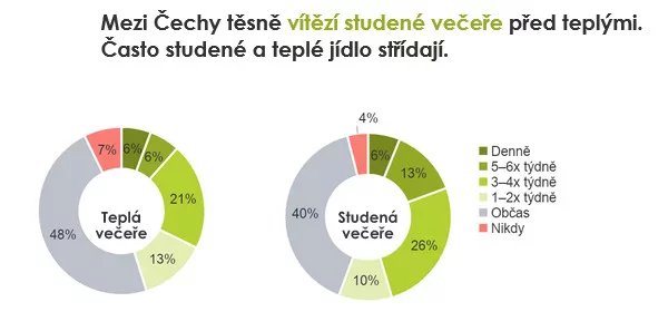 Jedním z nejvíce alarmujících zjištění průzkumu je nepravidelnost každodenního stravování Čechů. Snídani si například každý den dopřeje jen 68 %. Pouze necelá třetina pak denně svačí. Stěžejním jídlem dne tak zůstává oběd, který preferujeme zásadně teplý. Naopak k večeři si 56 % z nás alespoň občas dá spíše studený pokrm.