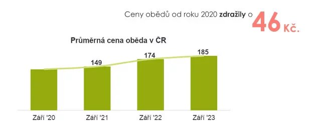 To, že ceny dlouhodobě rostou, potvrzují i data z Edenred Restaurant Indexu, který sleduje vývoj průměrné útraty Čechů za obědy. V září Češi za polední menu průměrně zaplatili 185 korun. V porovnání se stejným měsícem v roce 2020, kdy hlavní jídlo dne stálo v průměru 139 korun, tak za něj aktuálně zaplatí o třetinu (46 korun) navíc. Meziročně jeho cena stoupla o 11 Kč.