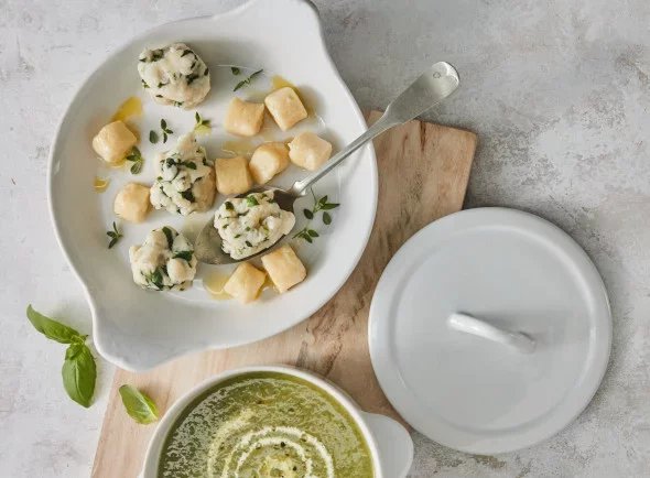 Navzdory tradicím, že do krémové polévky se hodí hlavně a maximálně opečený toustový chléb nebo rohlík, pro vás máme tip, jak krémovým polévkám dodat nový šmrnc. Přidejte do nich bramborové bylinkové nočky.