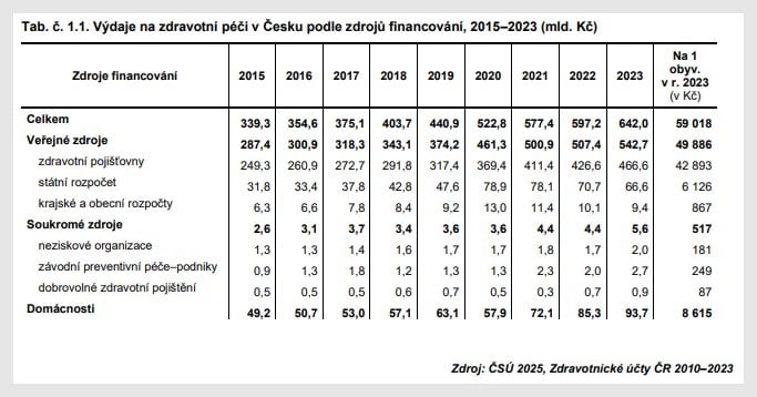Zatímco před deseti lety české domácnosti za rok zaplatily ve zdravotnictví dohromady 49 miliard, v roce 2023 to bylo už 93,7 miliardy, tedy bezmála 15 procent ze všech v tuzemsku utracených peněz za zdravotní péči. Ukazují to nejnovější data zveřejněná Českým statistickým úřadem (ČSÚ).