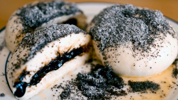 - Na každý talíř nalijte omáčku a do ní doprostřed posaďte knedlík. Posypejte mletým mákem s moučkovým cukrem.