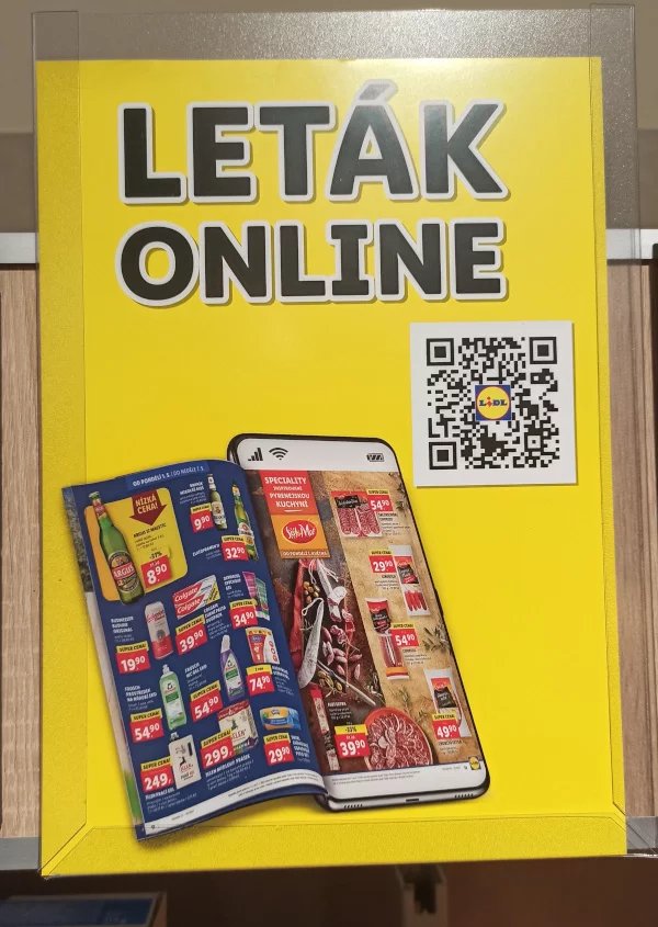 Například Lidl má ve svých obchodech mezi regály velký QR kód, z nějž si můžete aktuální leták platný pro danou prodejnu ihned stáhnout do svého telefonu.