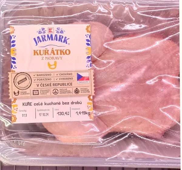 Menší kuřátko jen z moravských farem. Jarmark je privátní značka Kauflandu. Jak dlouhá je doba výkrmu, jsme zjišťovali u tiskové mluvčí Kauflandu, odpověď jsme nedostali.