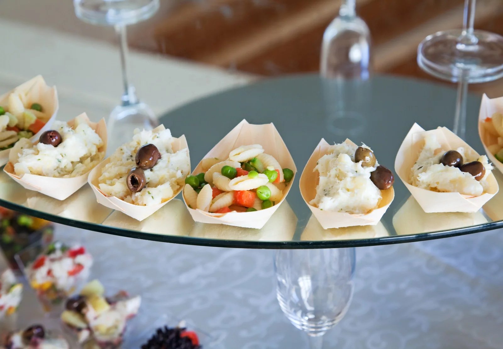 Saláty připravte z menších druhů těstovin a vložte do malých košíčků, přidejte trojzubce a máte skvělé zdravé pohoštění, jednohubky jinak